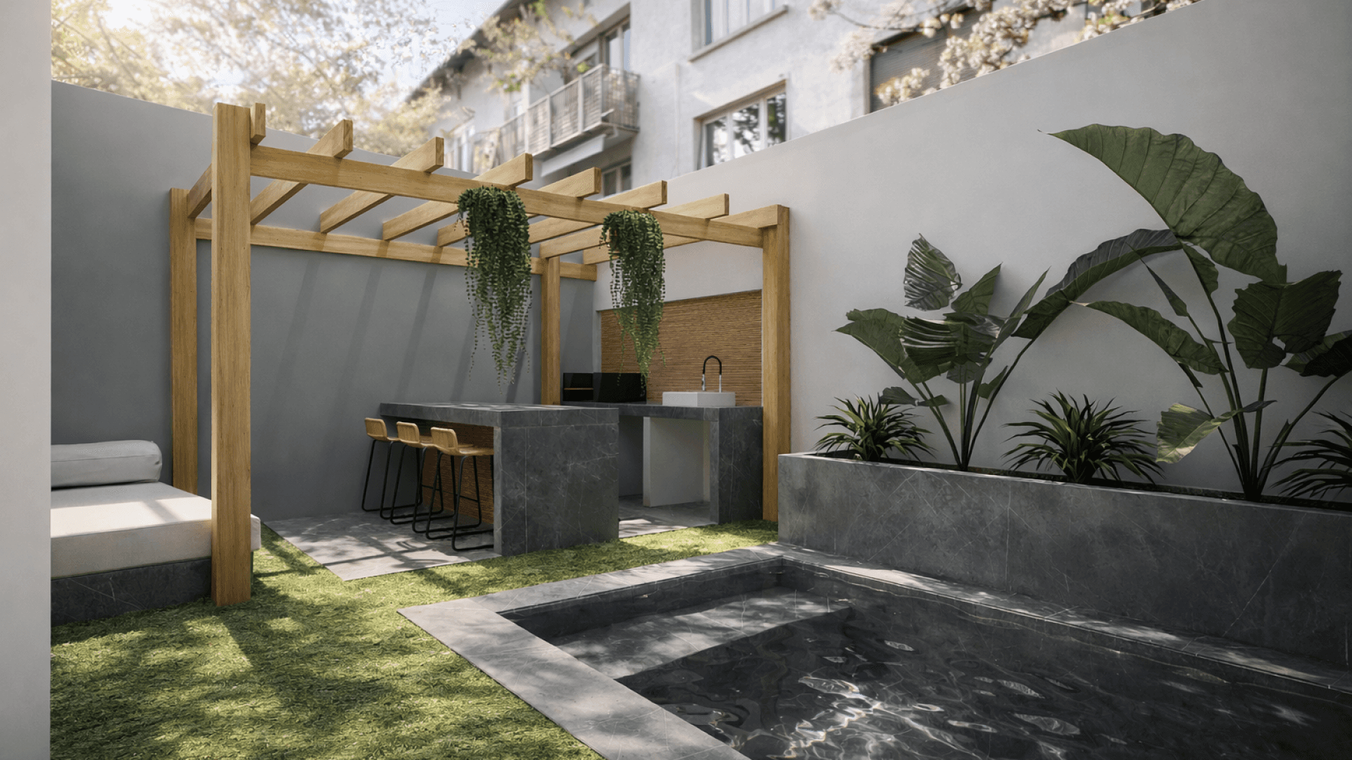 Se adquiere el segundo piso de un bloque de 3 vecinos, con la azotea dividida en dos para uso privativo. Se rediseña la distribución, añadiendo un baño extra a la suite y abriendo la cocina al salón. Además, se crea una terraza privada con vistas, cocina exterior, zona chillout y ducha exterior, ofreciendo un espacio íntimo y funcional.